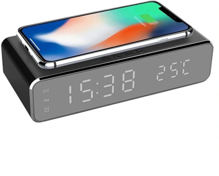 1. Vezeték nélküli telefon töltő (támogatja az iOS, Android, Windows vezeték nélküli töltésű eszközöket)2. Dátum3. Óra (12/24 órás váltás)4. Ébresztőóra (3 különböző ébresztési idő beállítható)5. Hőmérő (Celsius és Fahrenheit)6. Energiatakarékos mód (be / ki kapcsolható)